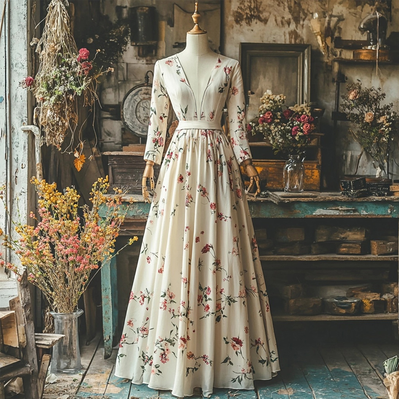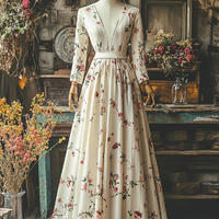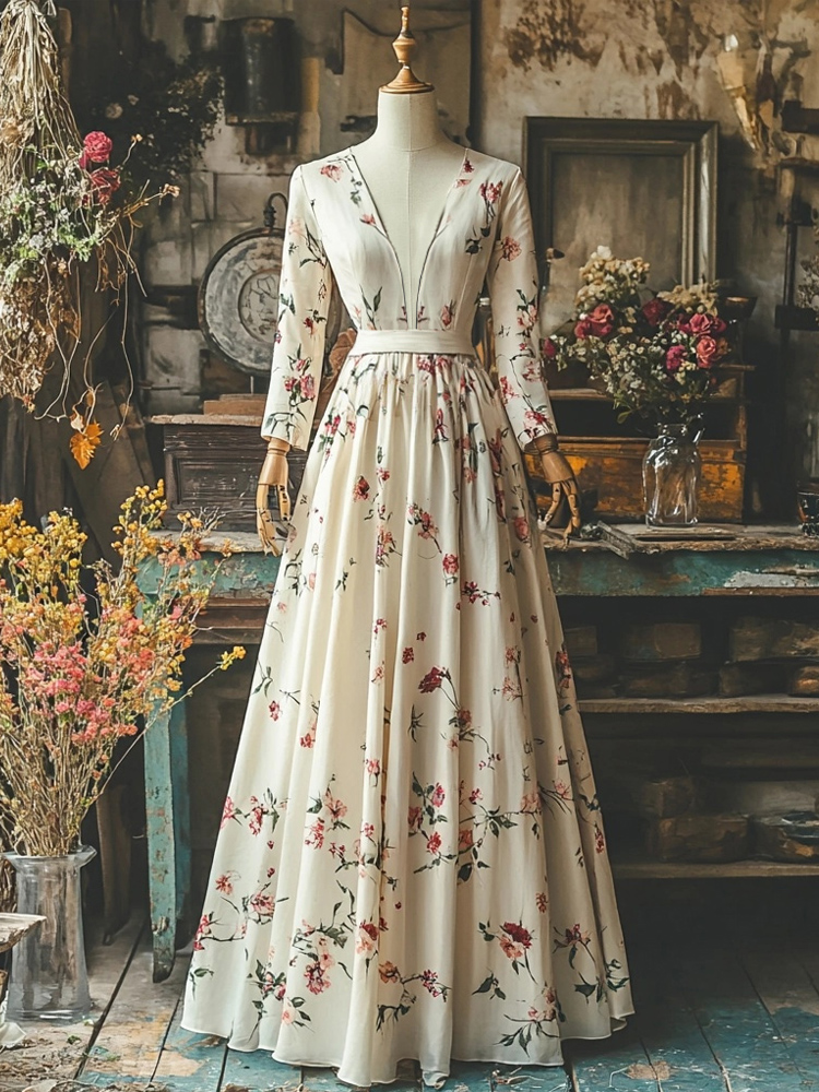 Romantic Elegant Floral Deep V Neck Vintage Maxi Dress