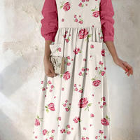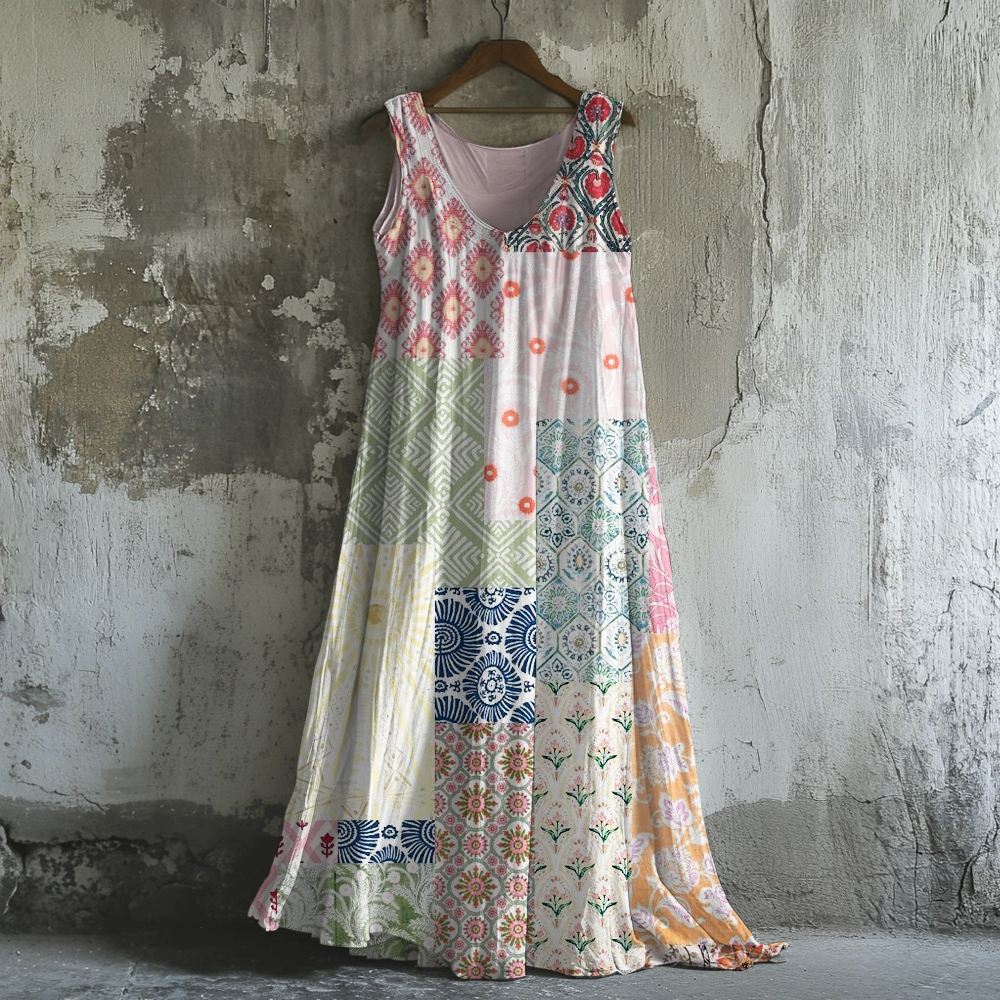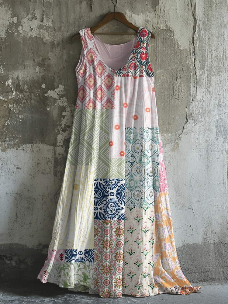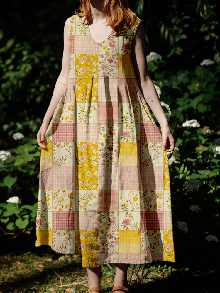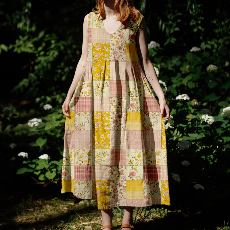 Vintage Cottagecore Floral Patchwork V Neck Linen Dress