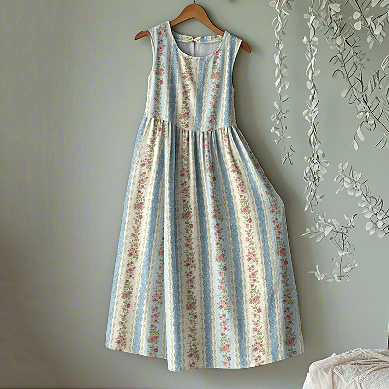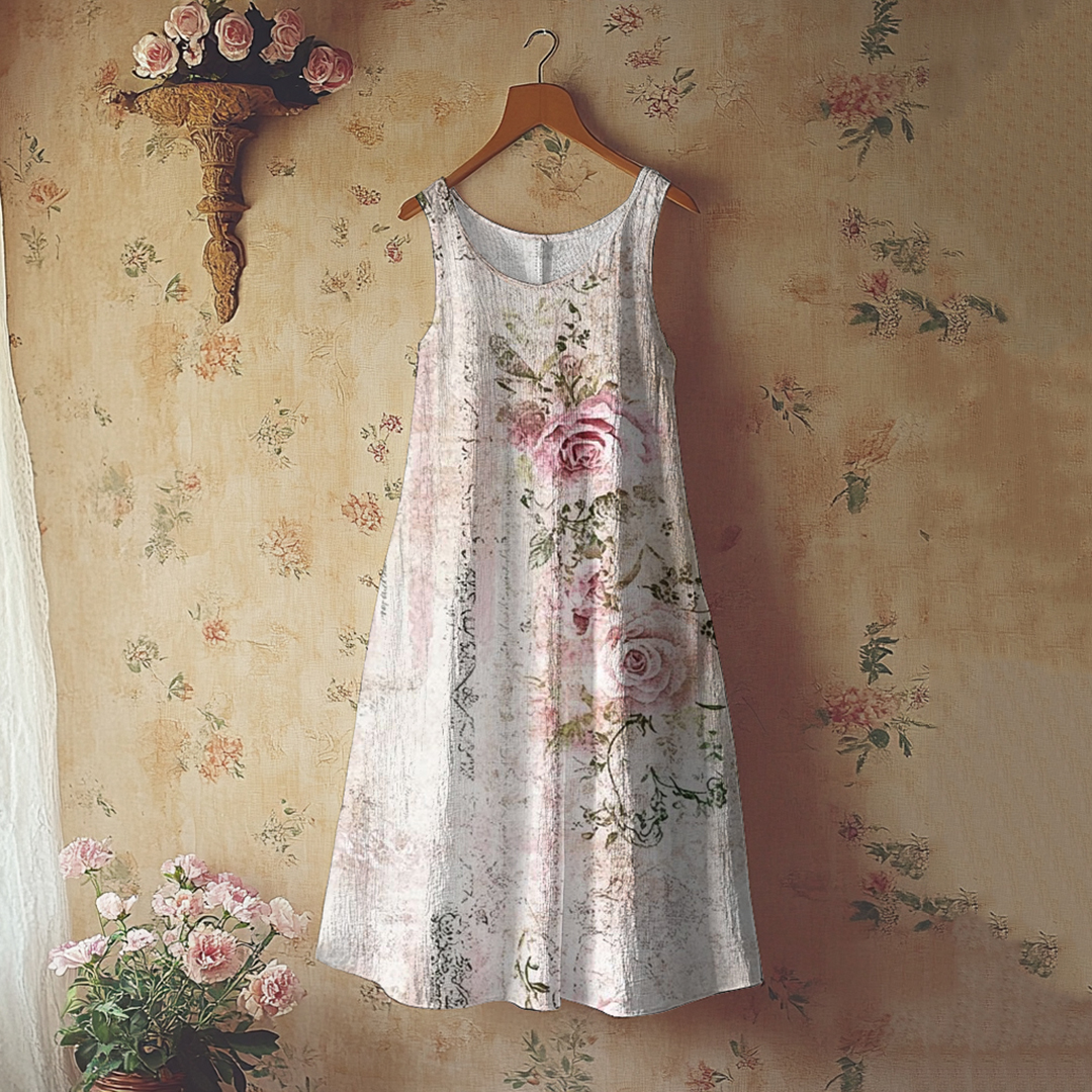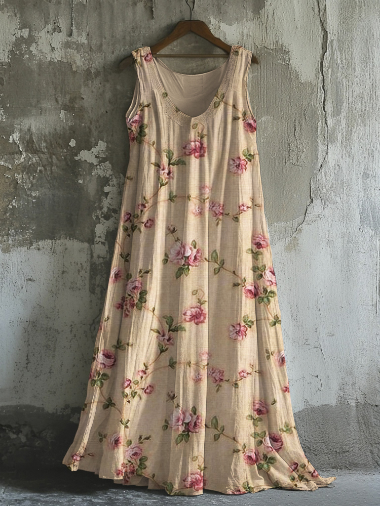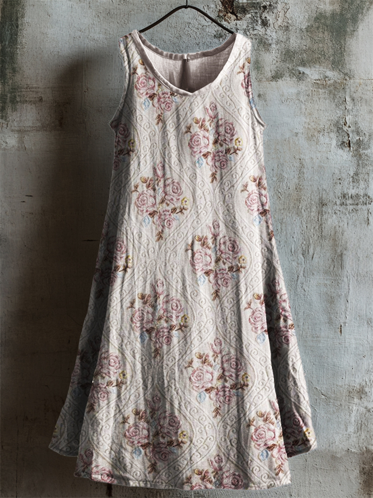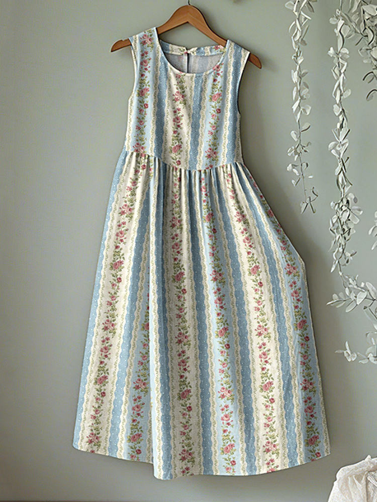 Vintage Floral Round Neck Sleeveless Midi Dress