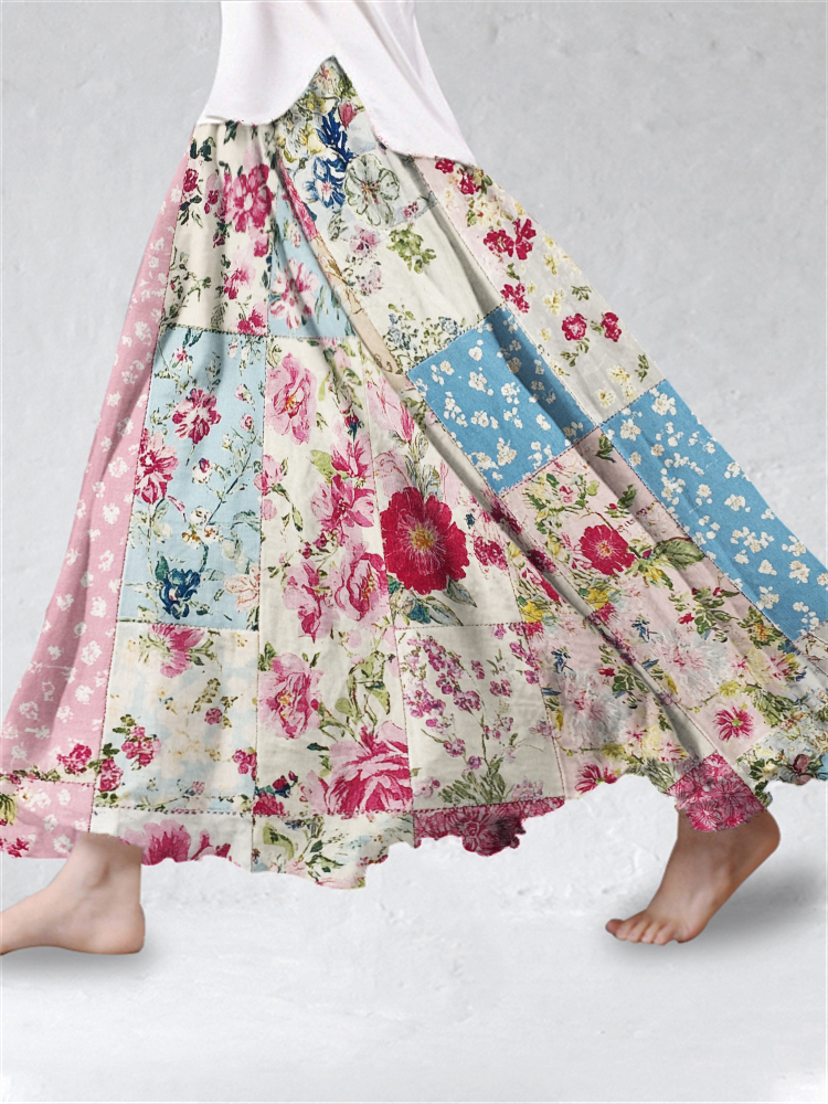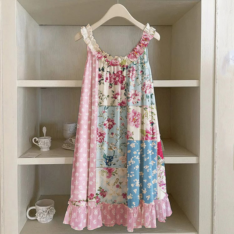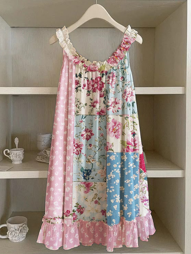 Cottage Floral Patchwork Ruffle Trim Linen Dress