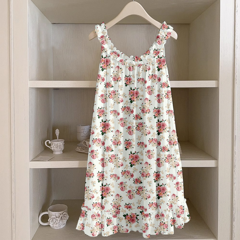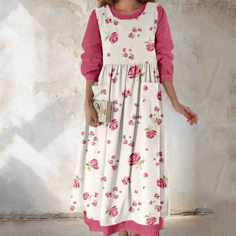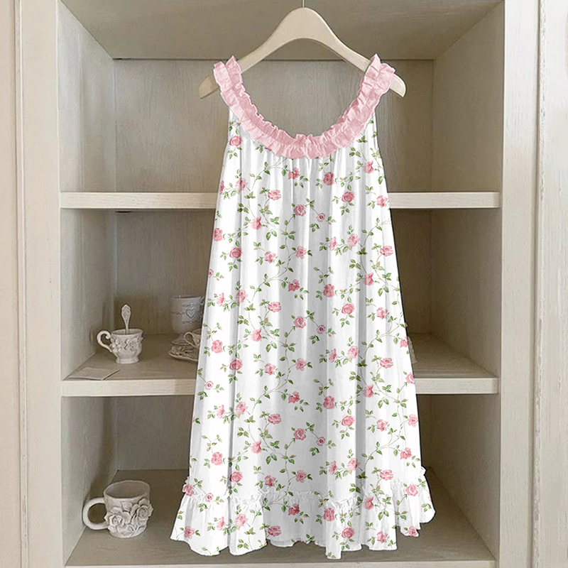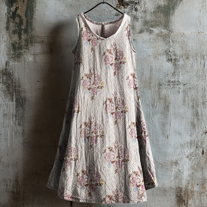 Vintage Roses Floral Ruffle Trim Linen Dress