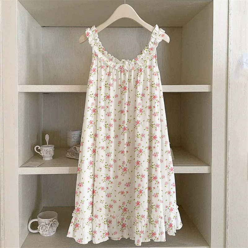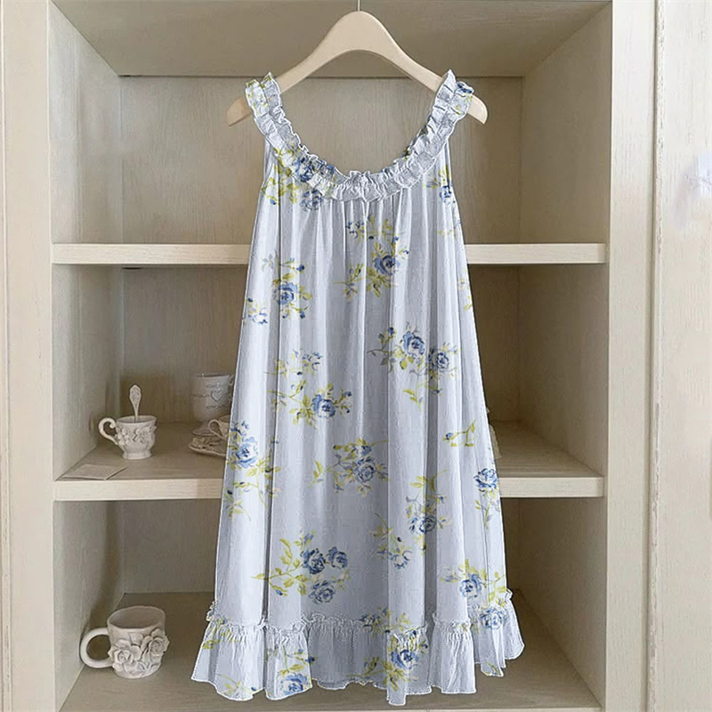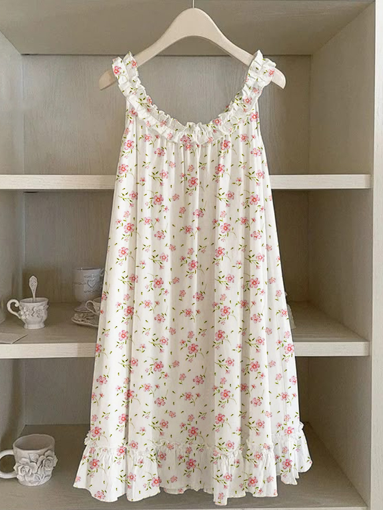 Vintage Cottage Floral Ruffle Trim Linen Dress
