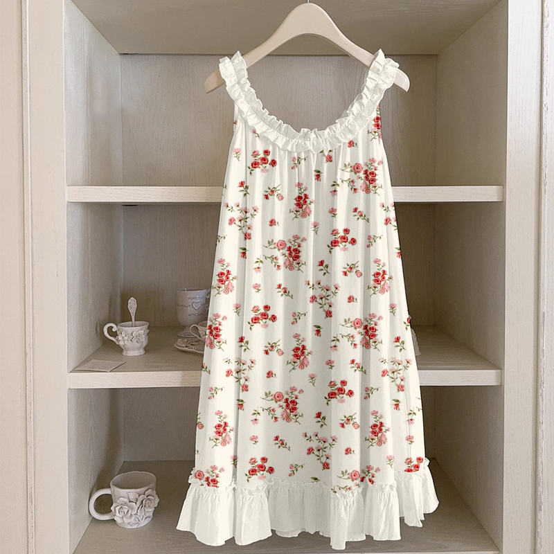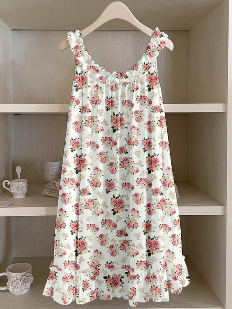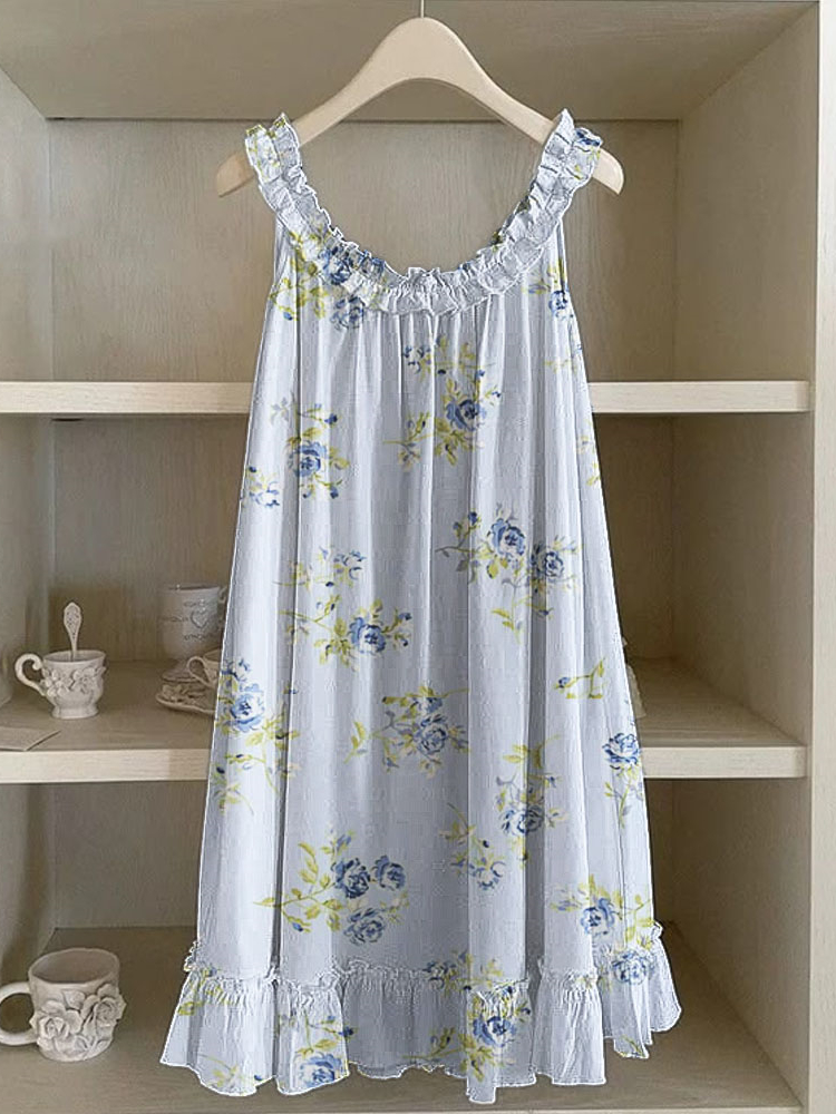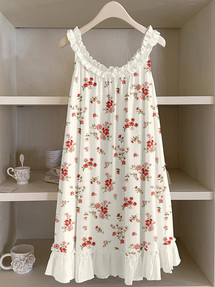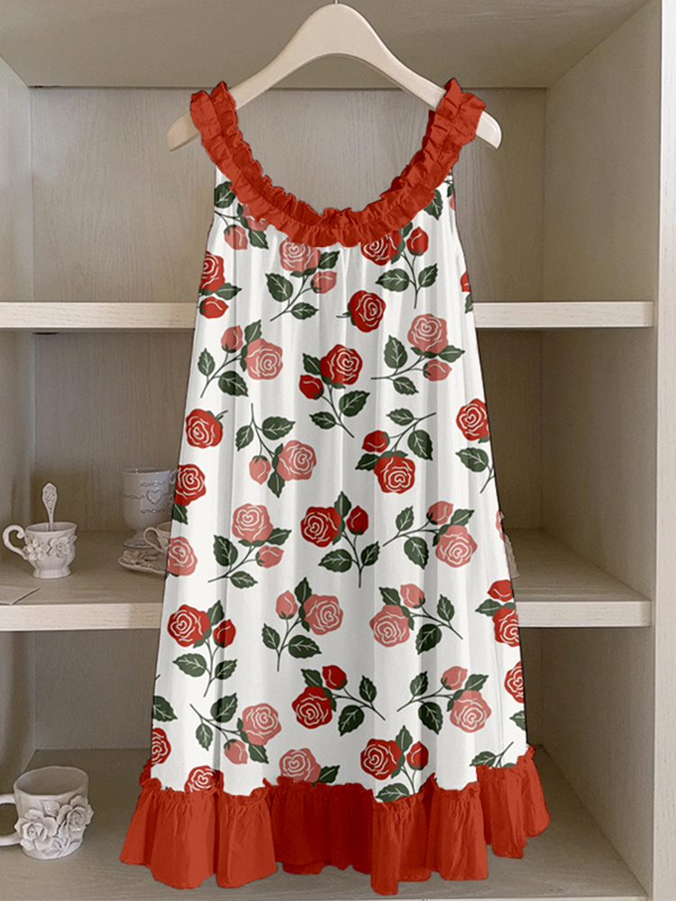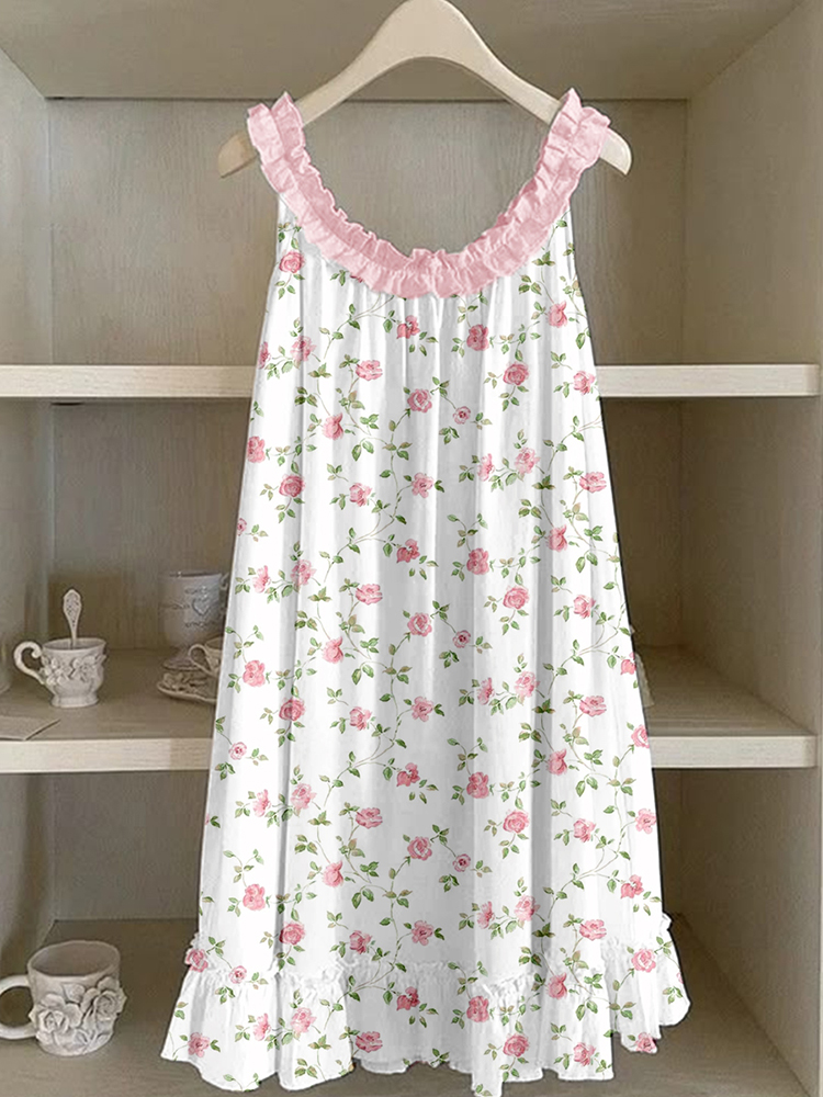 Cottagecore Roses Floral Pattern Ruffle Trim Linen Dress